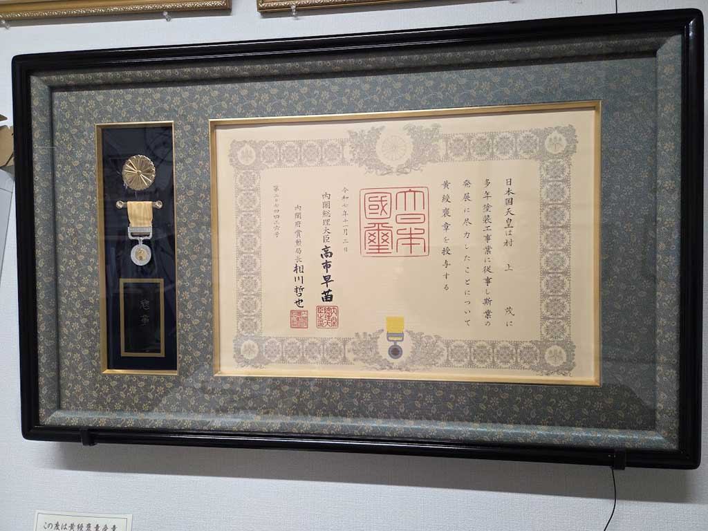 この度、令和7年秋の褒章におきまして、弊社 代表取締役 村上 茂 が、多年にわたる塗装工事業への従事と業務精励の功績により、「黄綬褒章」を受章いたしました。